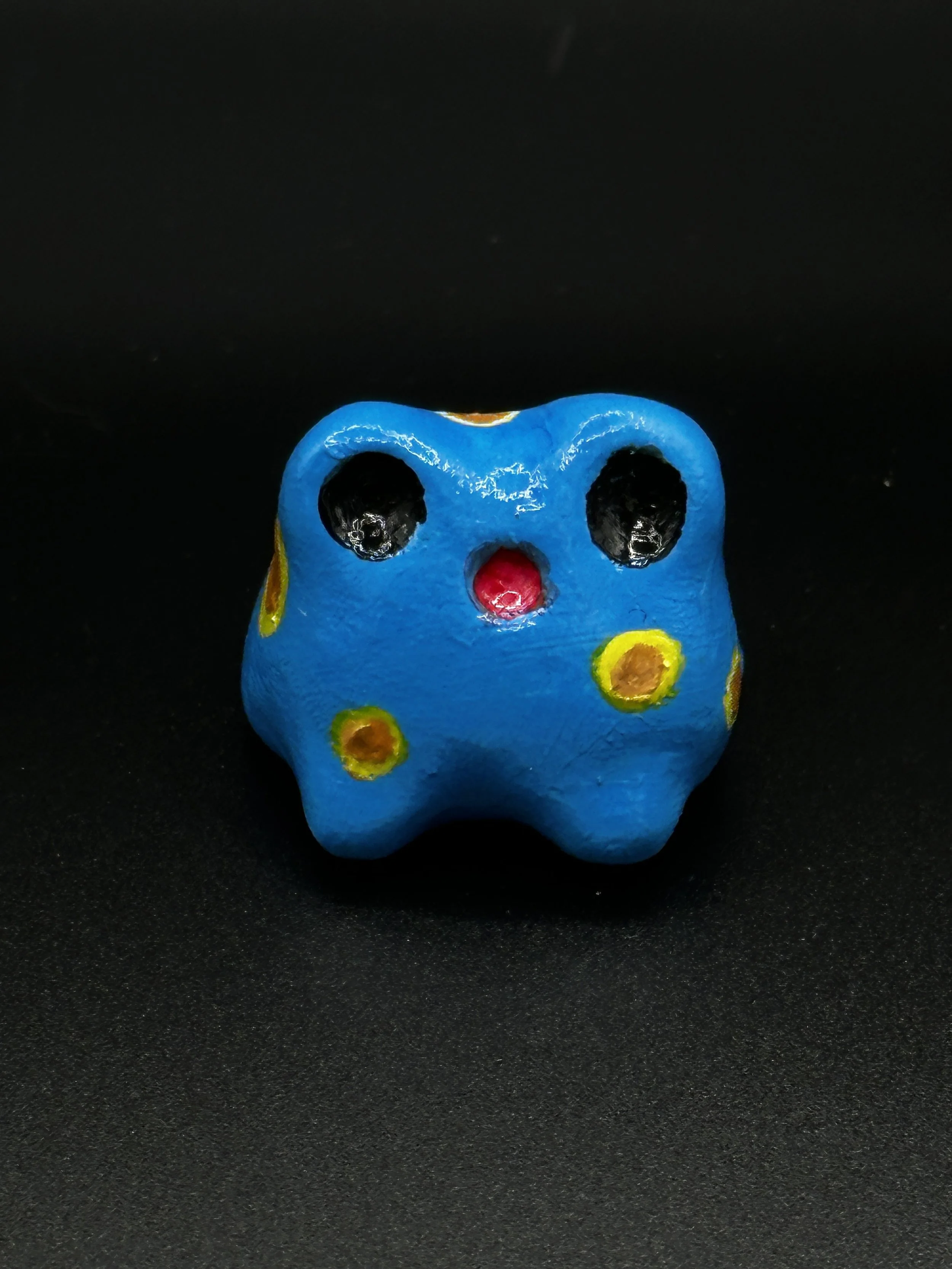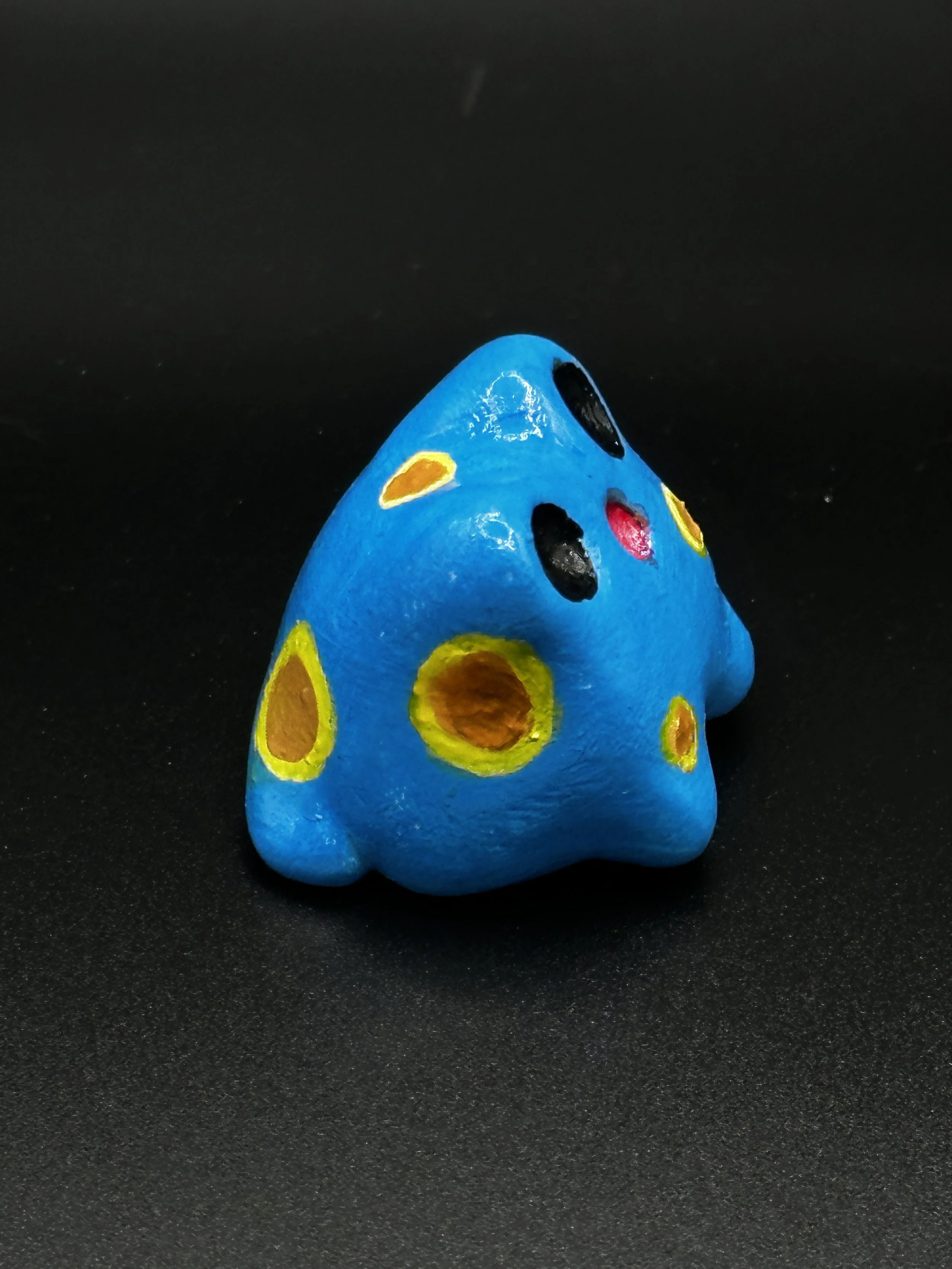 Ecco a te "Pallino Giallo", un simpatico mostriciattolo fatto a mano da N.V Art! Questo piccolo amico dalle forme tondeggianti e il colore blu brillante è decorato con divertenti pallini gialli e arancioni che catturano l'attenzione. Con il suo nasino rosso vivace e i grandi occhi neri, "Pallino Giallo" porta un sorriso ovunque si trovi. Un perfetto oggetto decorativo o un piccolo compagno creativo, ideale per chi ama l’arte originale e stravagante. Un pezzo unico da collezionare!